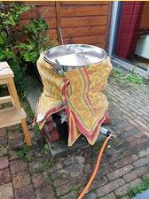 Zondag 's morgens vroeg was Bart al in de weer met het opzetten van de brouwerij. Geen ruimte genoeg in huis en het weer liet het toe, dus de tuin omgetoverd tot een brouwruimte