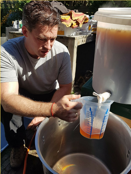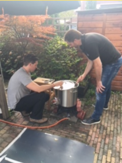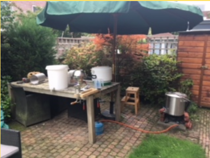 Zondag 's morgens vroeg was Bart al in de weer met het opzetten van de brouwerij. Geen ruimte genoeg in huis en het weer liet het toe, dus de tuin omgetoverd tot een brouwruimte.
