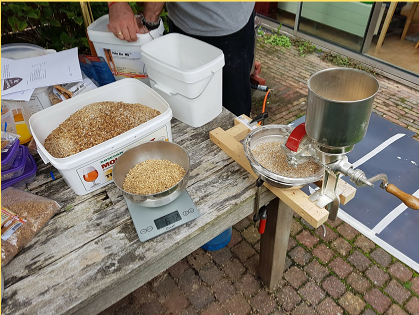 Allereerst de mouten wegen en schroten. We gaan twee verschillende bieren brouwen, dus een extra grote hoeveelheid van verschillende mouten staan al klaar.